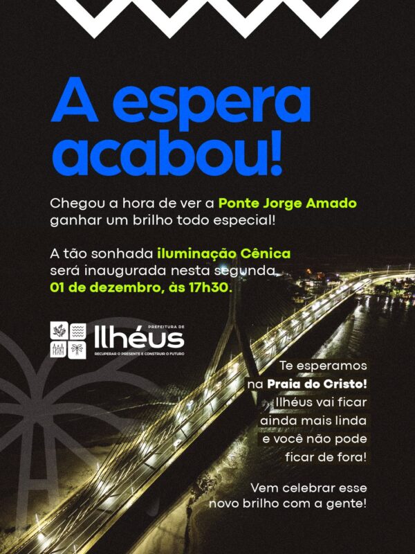 ByRedação30/11/2025A Prefeitura de Ilhéus inaugura, nesta segunda-feira, 1º de dezembro, a nova iluminação cênica da Ponte Jorge Amado, um dos principais cartões-postais da...